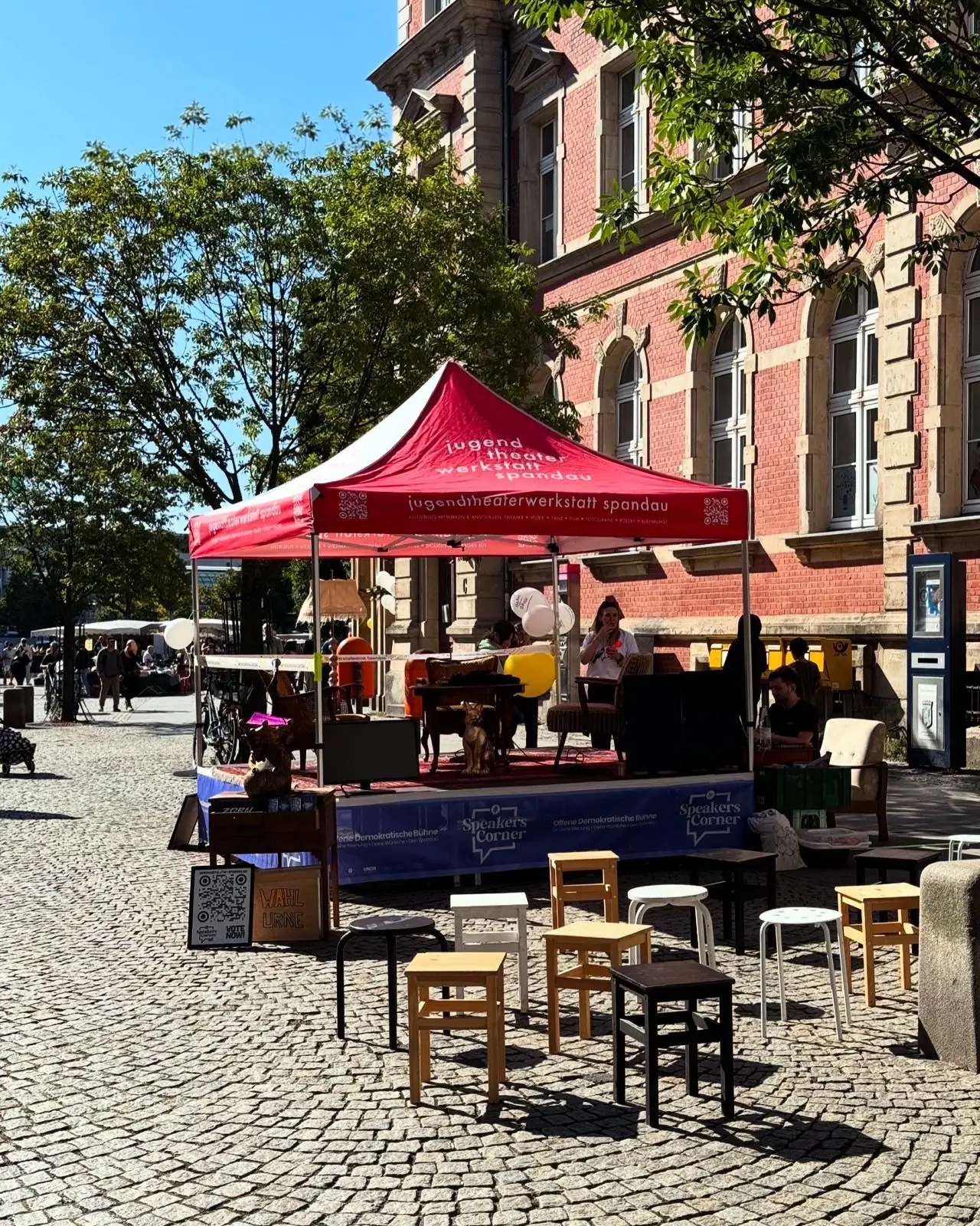 Am 21.9.2024 haben wir uns am Demokratiefestival Spandau mit einer offenen Diskussions- und Redeplattform beteiligt (in Kooperation mit der jtw spandau). Dabei konnten wir u.a. mit spontanen Gästen aus der Politik (Helmut Kleebank (MdB), Raed Saleh (Vorsitzender der SPD-Fraktion), Gregor Kempert (Stadtrat), sowie Naemi Jordan (Partnerschaften für Demokratie) über aktuelle Gefahren und über die Aussichten für ein Verbot der AfD sprechen.